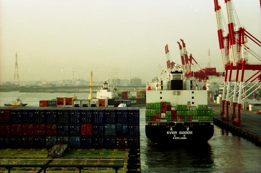大阪港早朝の狭視界中を入港する船団、阪神淡路大震災直後です。